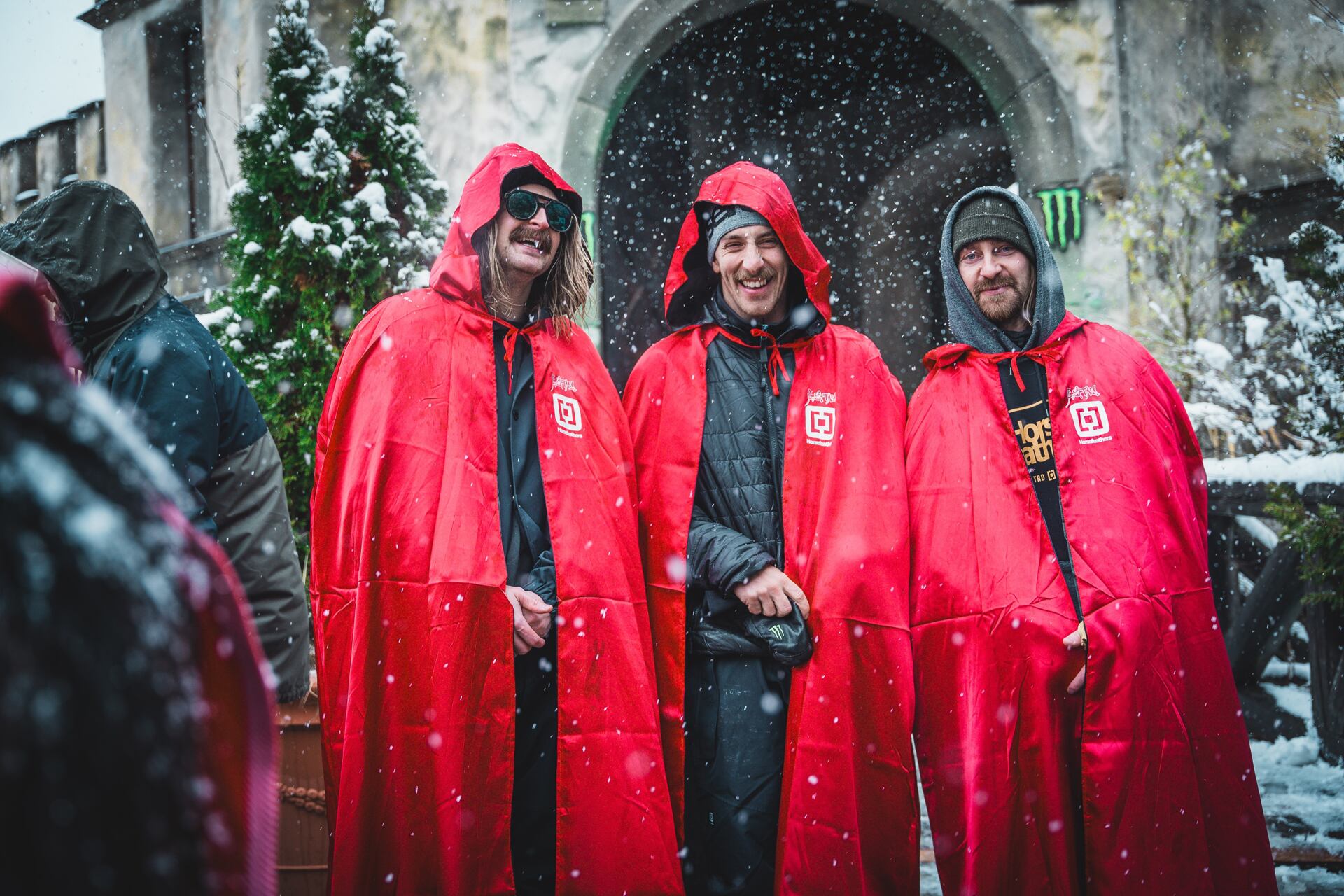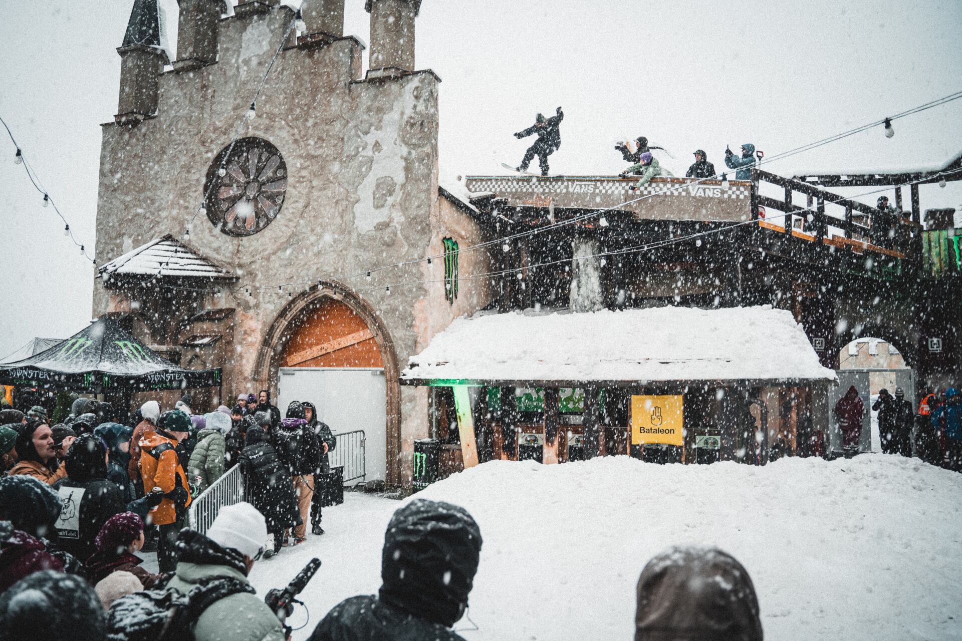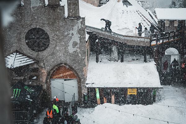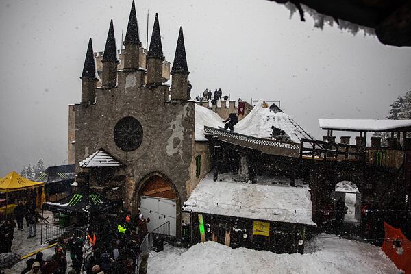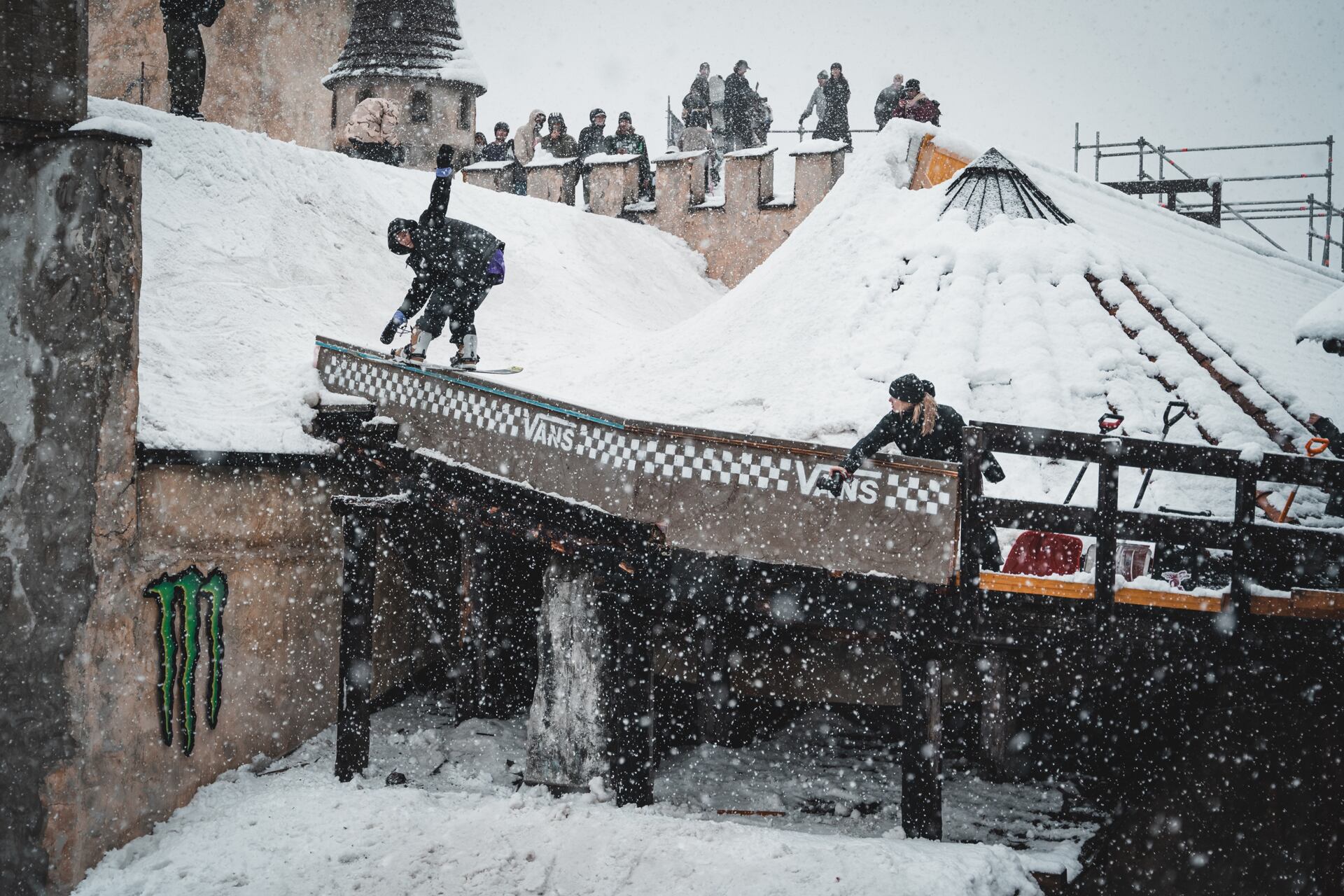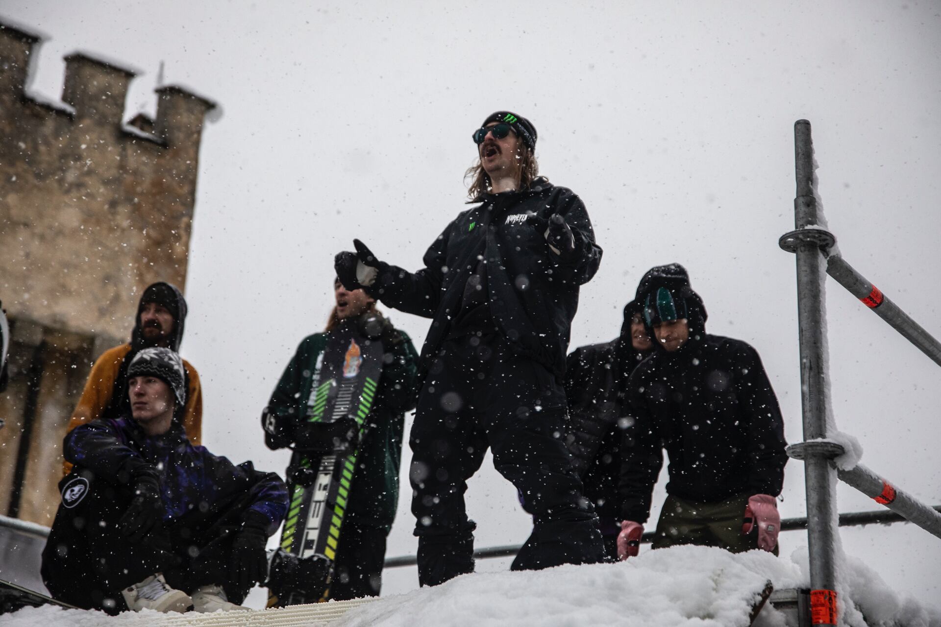 Akci zahájil velkolepý příchod Ethana a bratrů Helgasonových v dobových pláštích a na koních. Po úvodním přivítání a poděkování z Ethanovy strany se rozpoutalo to, pro co si diváci přišli. Nevíme jak vy, ale my jsme byli svědky snowboardingu na hradních zdech a střechách poprvé a musíme přiznat, že to bylo víc než epické! Atmosféru podtrhovalo nepřestávající sněžení, žízeň průběžně zažehnávalo pivko z našeho stánku a hecovačky všech riderů se stupňovaly. Full send dne patřil Ethanovi, který hradbu Seefeldského hradu dropl z vrchu až dolů bez mezilandingu na střeše.