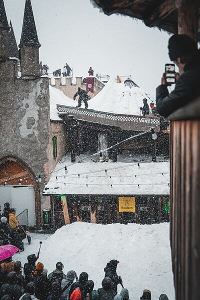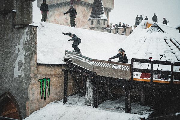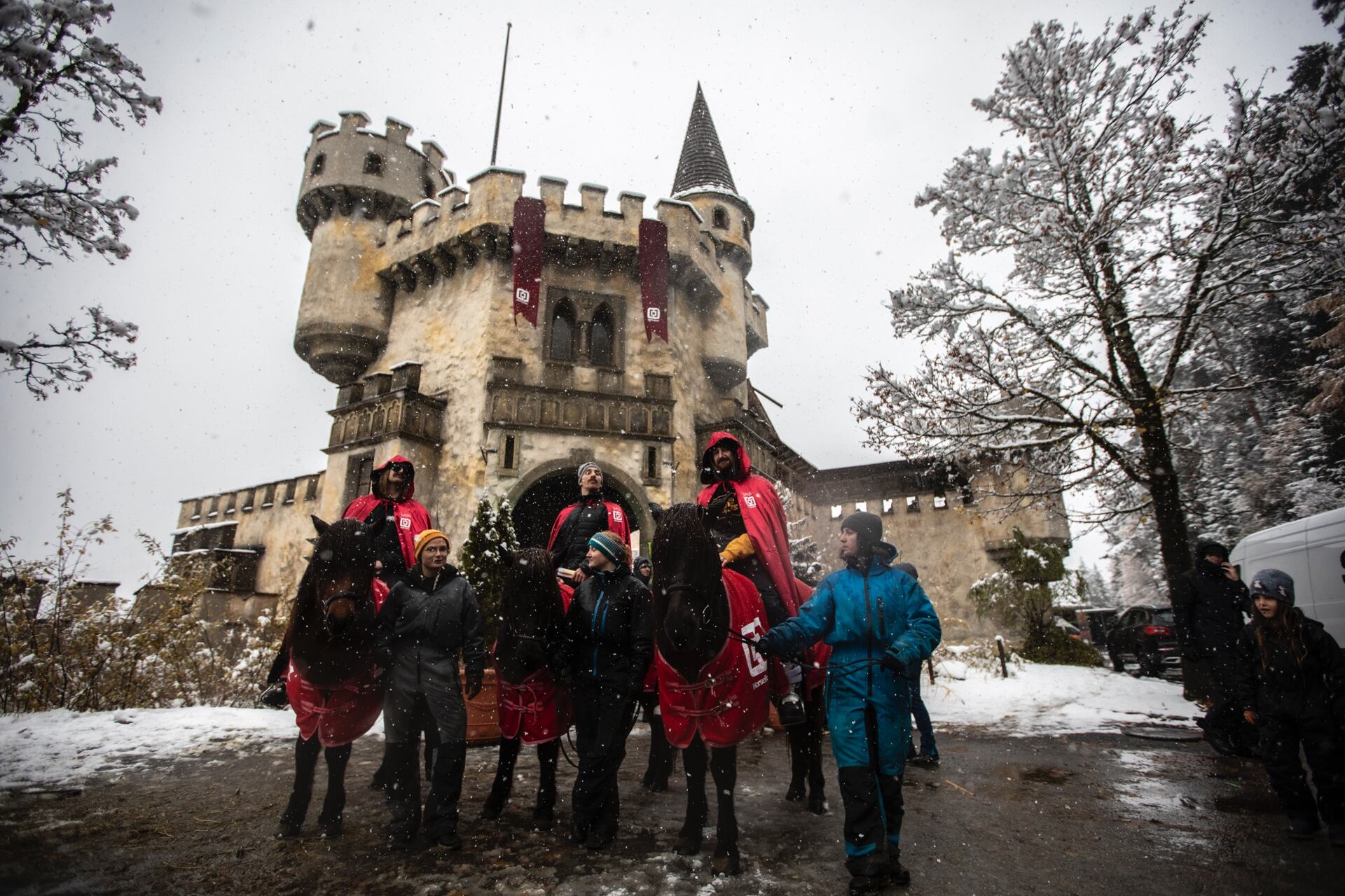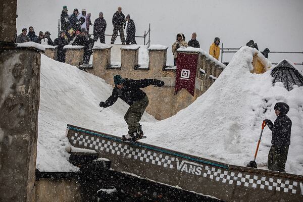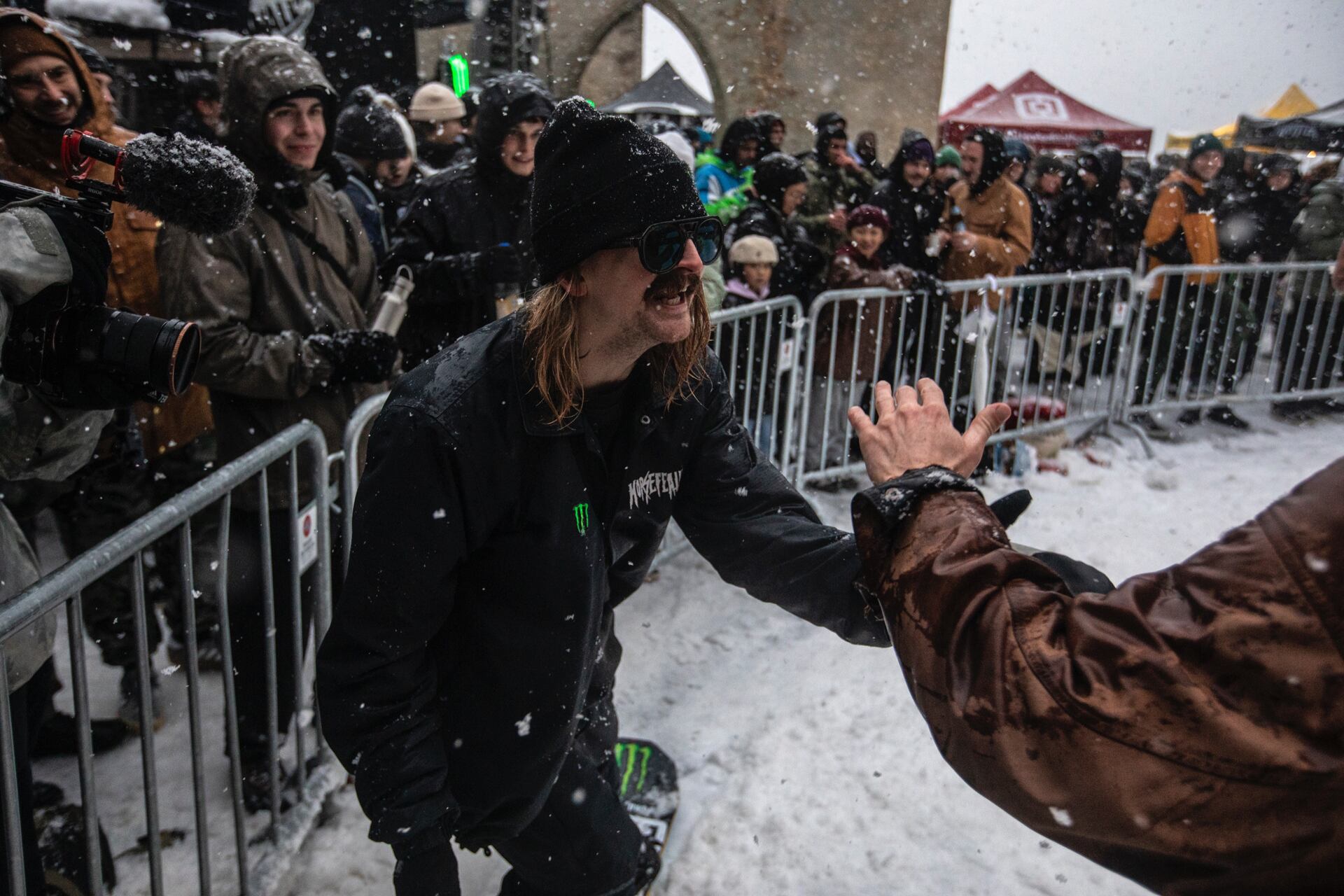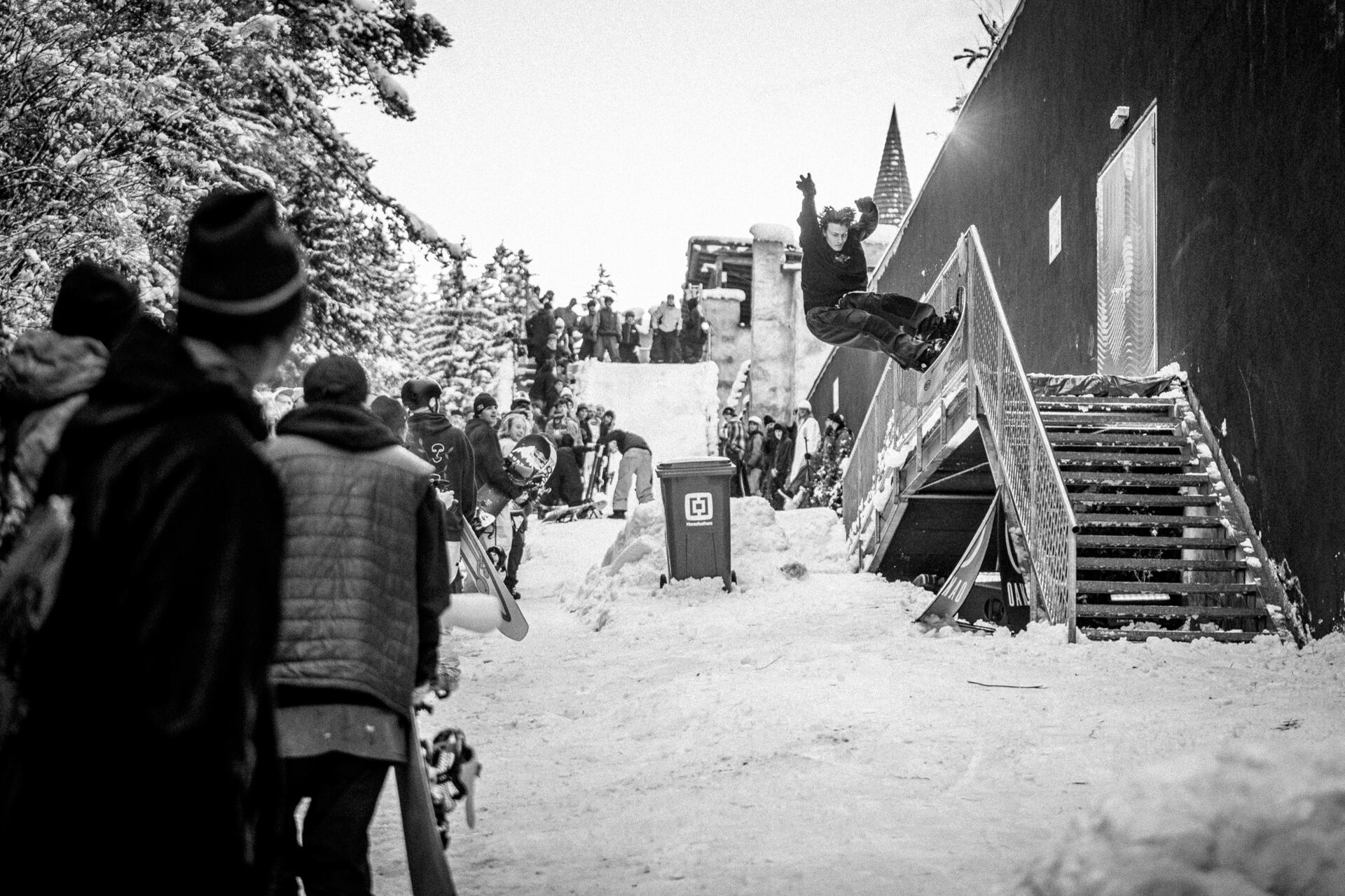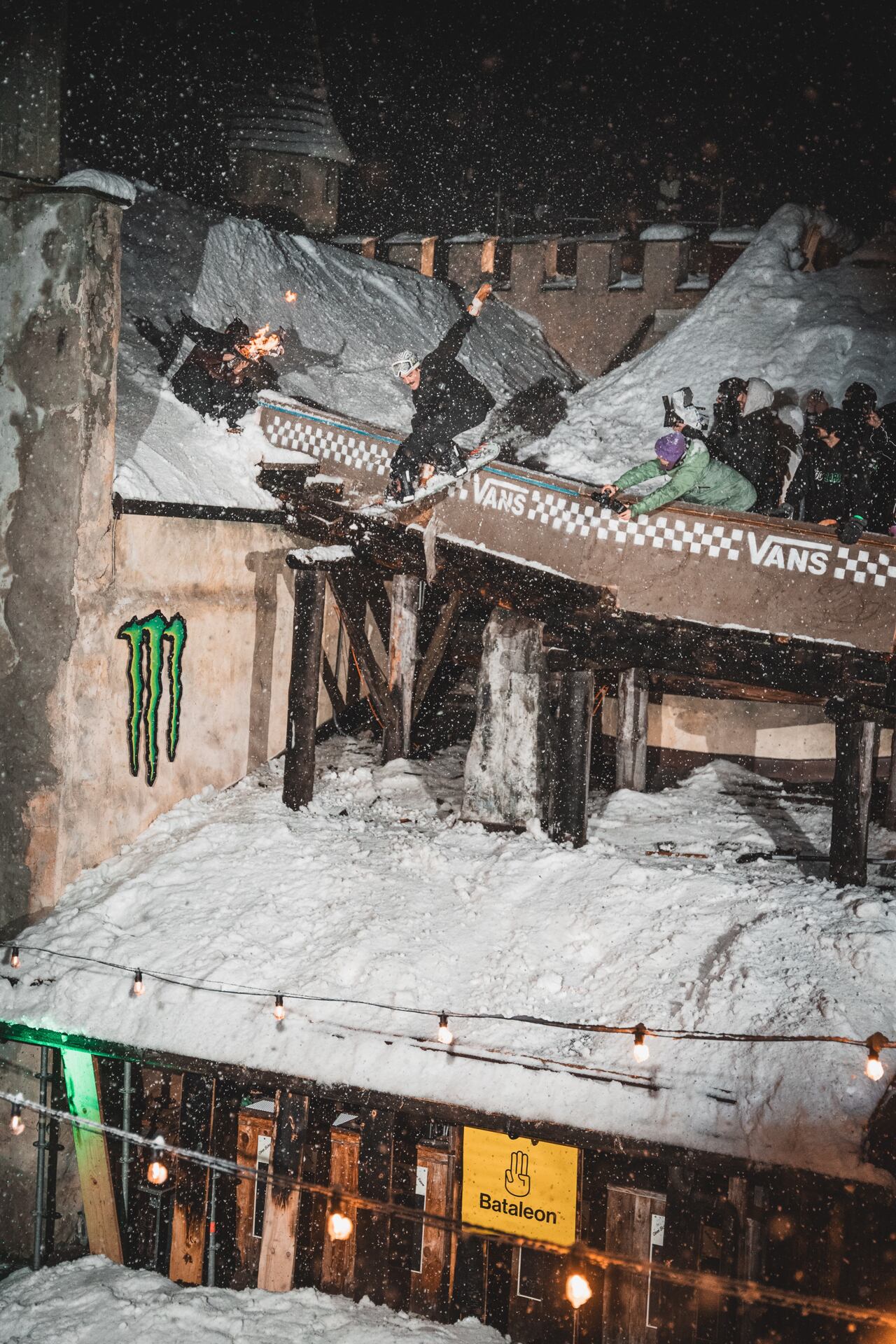Akci zahájil velkolepý příchod Ethana a bratrů Helgasonových v dobových pláštích a na koních. Po úvodním přivítání a poděkování z Ethanovy strany se rozpoutalo to, pro co si diváci přišli. Nevíme jak vy, ale my jsme byli svědky snowboardingu na hradních zdech a střechách poprvé a musíme přiznat, že to bylo víc než epické! Atmosféru podtrhovalo nepřestávající sněžení, žízeň průběžně zažehnávalo pivko z našeho stánku a hecovačky všech riderů se stupňovaly. Full send dne patřil Ethanovi, který hradbu Seefeldského hradu dropl z vrchu až dolů bez mezilandingu na střeše.