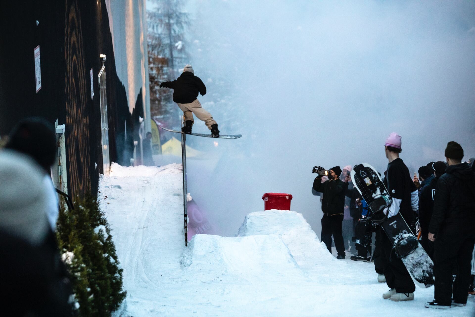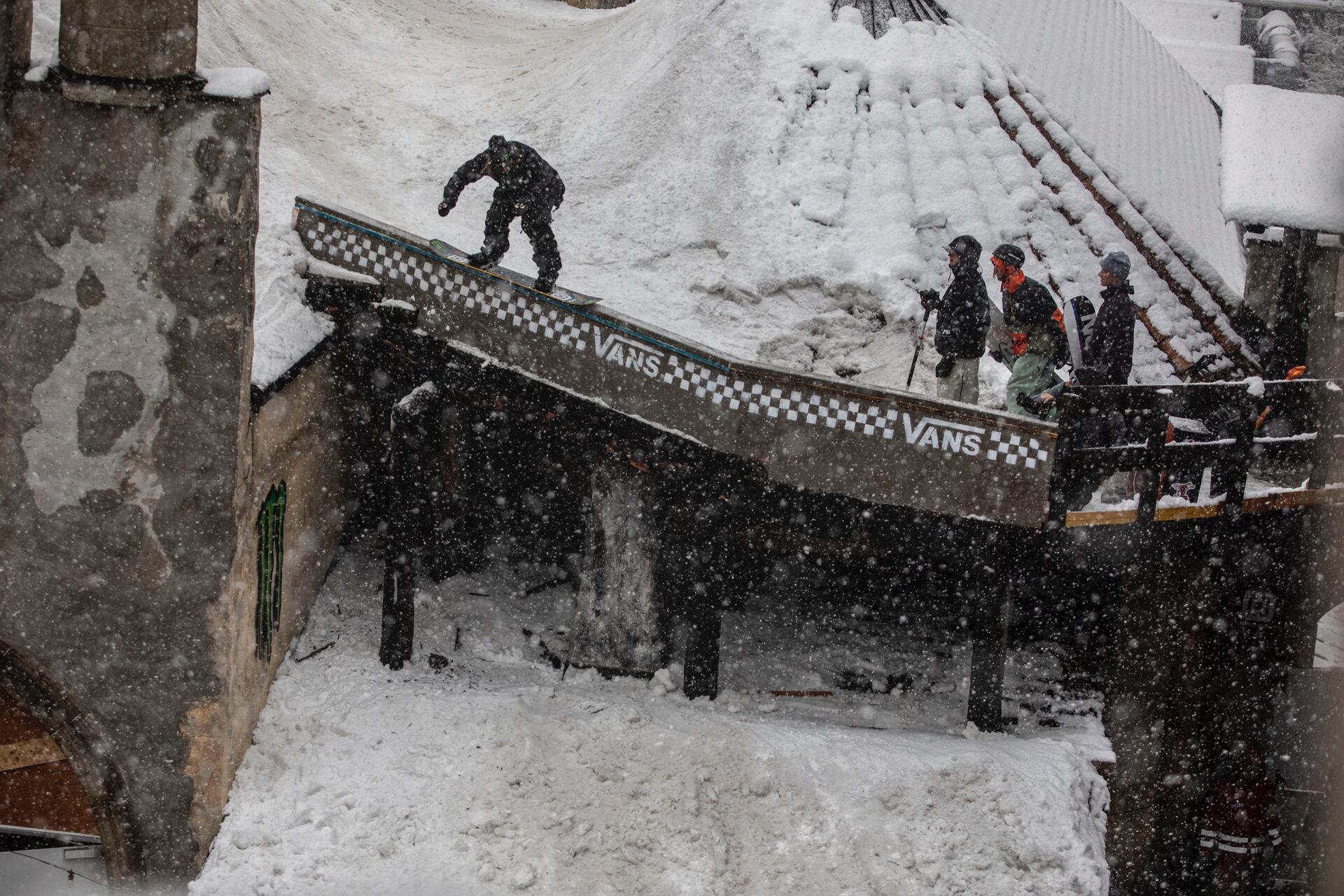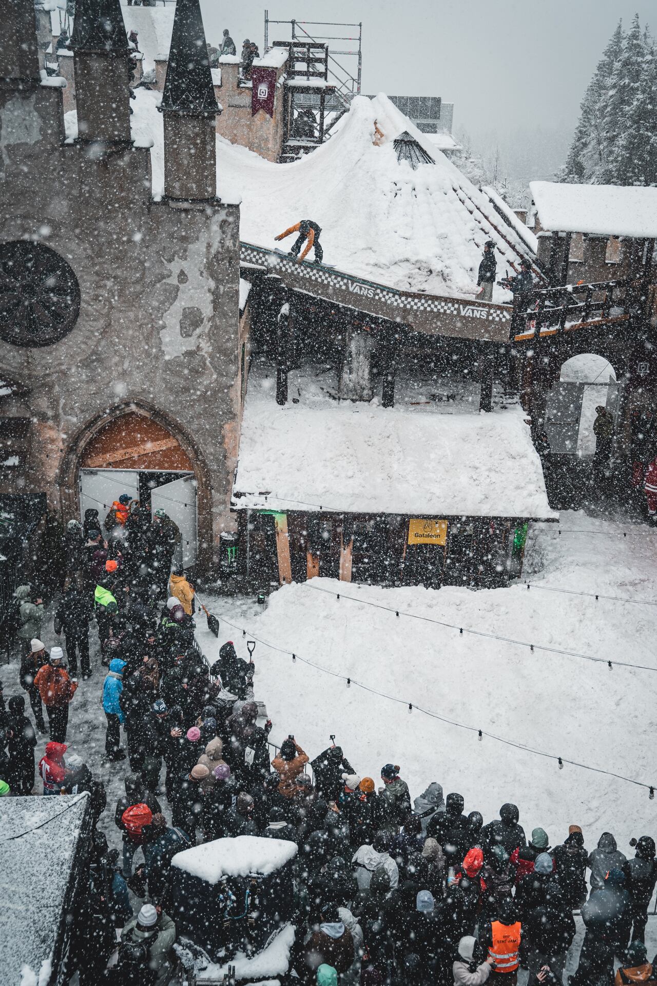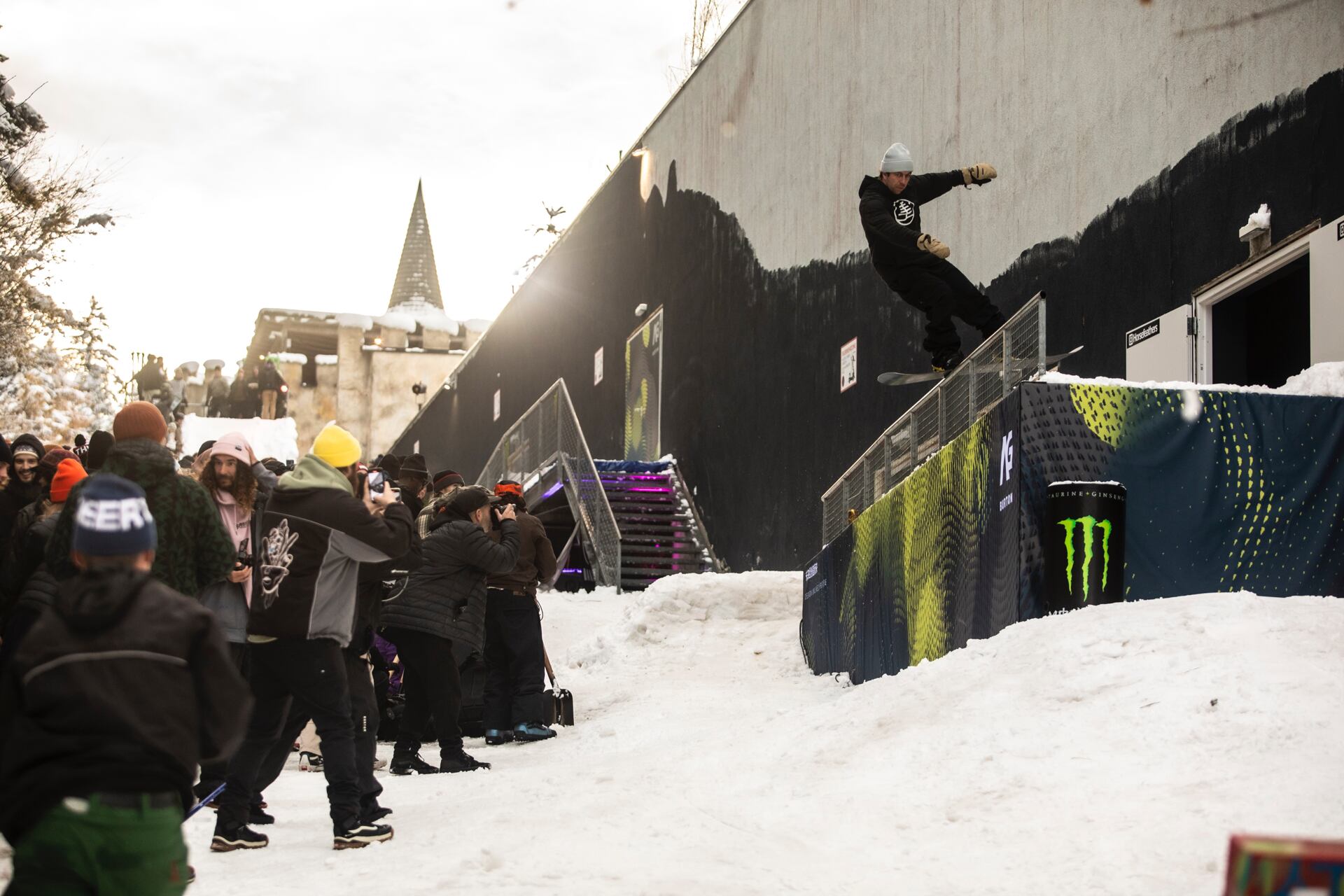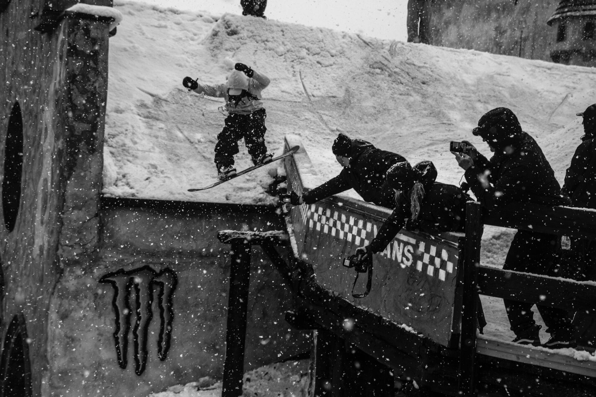 Akci zahájil velkolepý příchod Ethana a bratrů Helgasonových v dobových pláštích a na koních. Po úvodním přivítání a poděkování z Ethanovy strany se rozpoutalo to, pro co si diváci přišli. Nevíme jak vy, ale my jsme byli svědky snowboardingu na hradních zdech a střechách poprvé a musíme přiznat, že to bylo víc než epické! Atmosféru podtrhovalo nepřestávající sněžení, žízeň průběžně zažehnávalo pivko z našeho stánku a hecovačky všech riderů se stupňovaly. Full send dne patřil Ethanovi, který hradbu Seefeldského hradu dropl z vrchu až dolů bez mezilandingu na střeše.