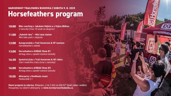 V sobotu 9. 8. jede celý program ve spolupráci s Horsefeathers a je zdarma. Dorazí HF crew – Tomáš Zejda, Teodor Kováč, Vilibald Vítek, Jakub Hejl a Andy Mitaš. Těšte se na airbag show, společnou jízdu, coaching a spoustu zábavy.