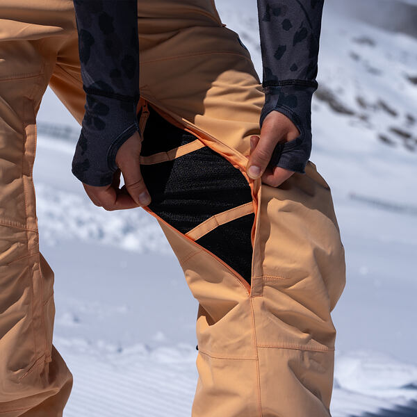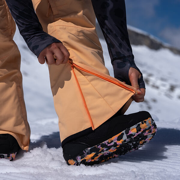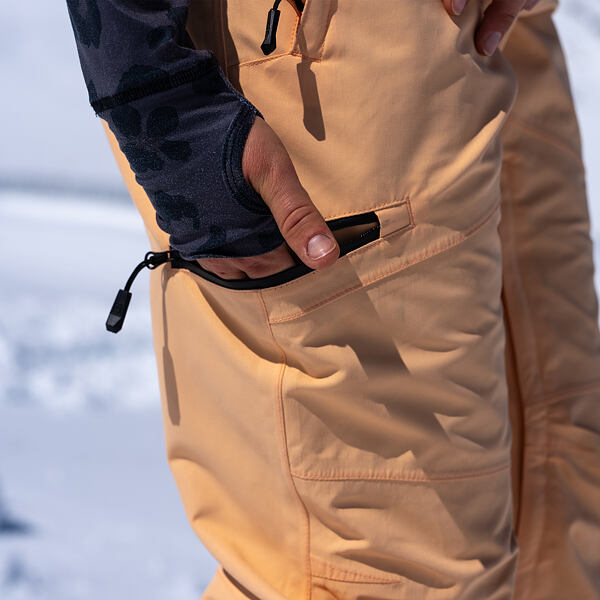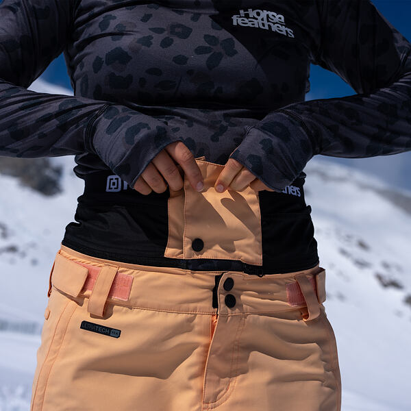 Odepínatelný protisněžný pás kalhot zabraňuje vniknutí sněhu při pádu nebo jízdě v prašanu.
